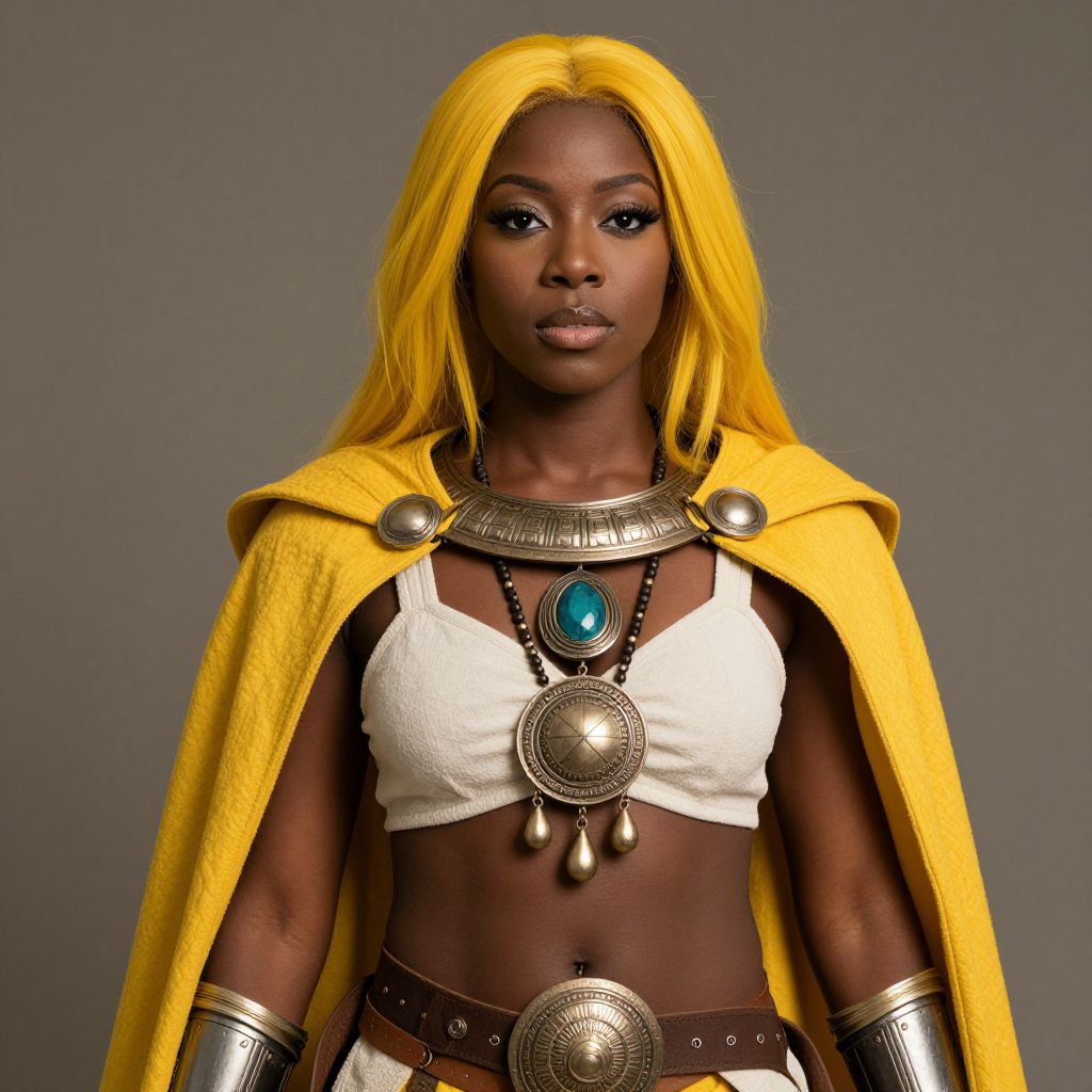 A beautiful black woman with yellow hair, wearing a warrior's necklace and a yellow cloak, stands confidently.