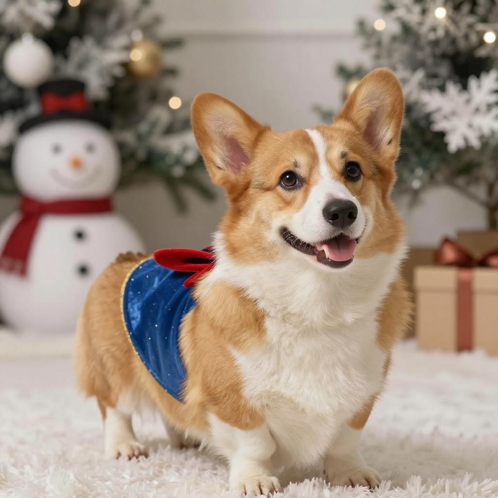 Realistic photo. Pembroke Welsh Corgi dressed as a Snow White posing for an image, cheerful and festive. realistic photo