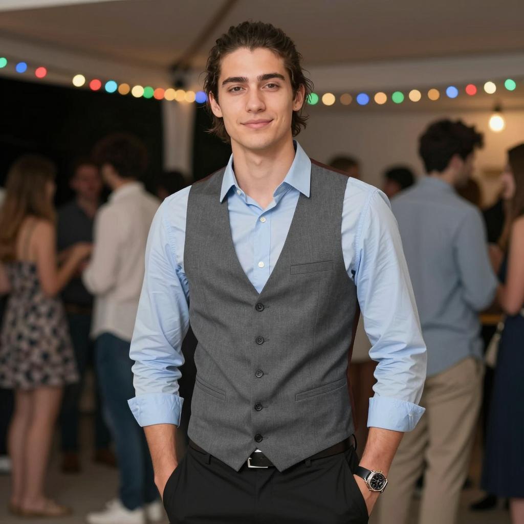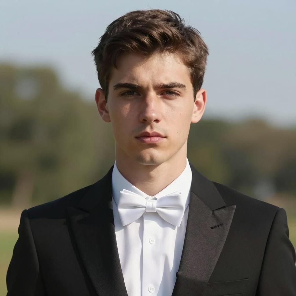 Photorealistic medium shot of a young man with long brown side-swept hair and a slight mustache, wearing a black suit, white shirt, black tie, and beige pocket square. He has a serious expression and stands confidently in natural daylight with soft shadows. The outdoor urban setting includes blurred background figures and buildings, suggesting a stylish social gathering or costume party.