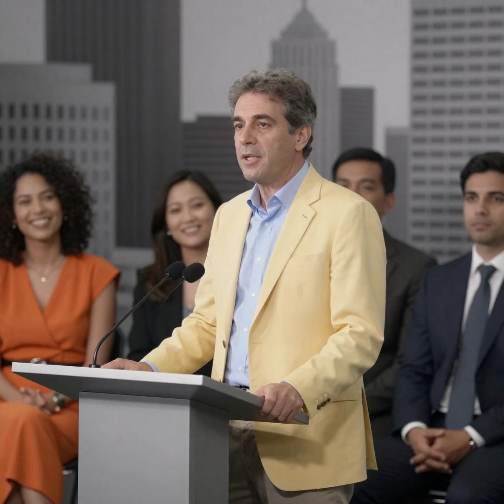 Photograph of a panel discussion. Middle-aged man in yellow suit and blue shirt stands at podium, speaking, with two women and two men in suits seated behind him. Monochrome cityscape background. Woman in orange top laughs, curly-haired woman smiles. Two men in suits look serious. Microphones on podium.