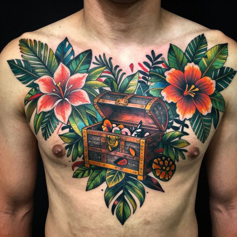 Jungle chest tattoo, colorful traditional style with dense leaf patterns, tropical flowers, and a hidden treasure chest design in the center of the chest, dynamic with textured ink effect