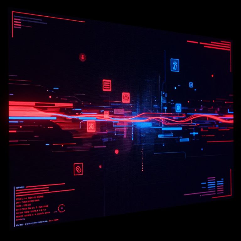 Pixu screen displaying a glitching interface with abstract data streams, cyberpunk aesthetic, dark background with red and blue accents, floating icons, immersive digital environment, high-contrast colors, futuristic tech vibe.