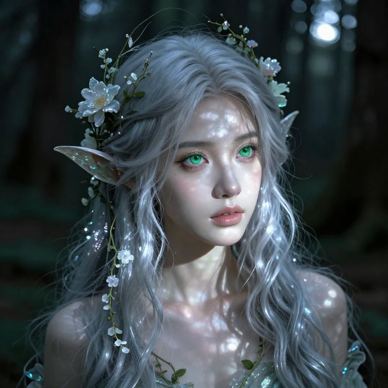 A highly detailed photorealistic portrait showcases a captivating female fae with cascading silver locks adorned in iridescent floral vines. Framed by the ethereal glow of an ancient forest, her piercing emerald eyes hold a mysterious depth as she gazes into the distance. Porcelain skin, illuminated by dappled moonlight filtering through the trees, adds to the otherworldly beauty and intrigue captured from an aerial perspective.