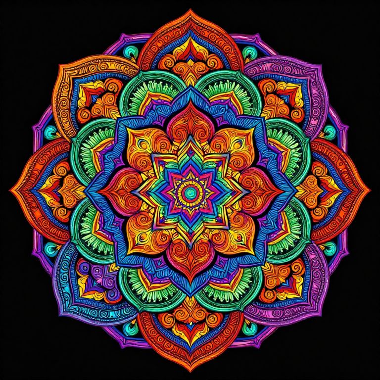 Vibrant digital mandala with intricate, colorful patterns in neon orange, red, blue, green, and purple on a black background.