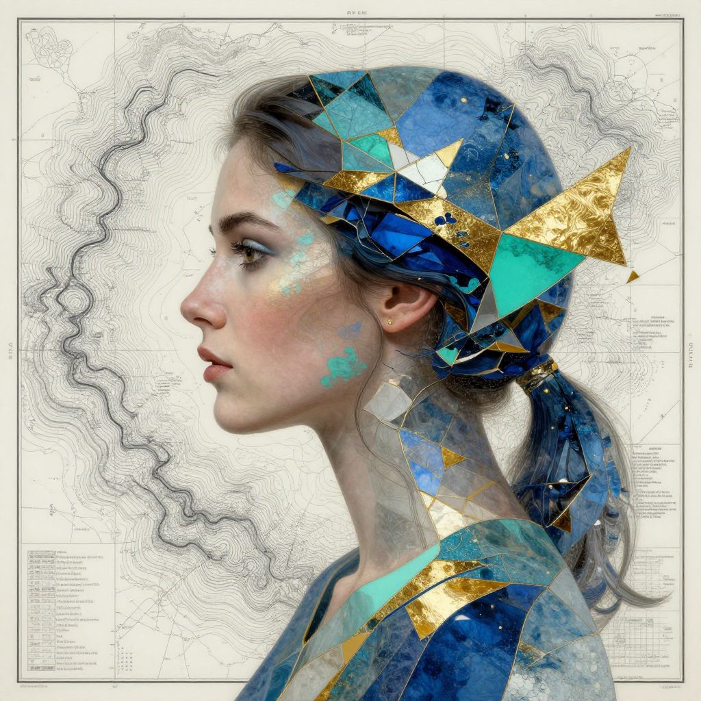 An intricate, abstract portrait of a woman in profile, merging with a topographic sea chart featuring isolines, geometric aesthetics, and patches of blue, teal, and liquid gold shades, all rendered with meticulous, hyper-realistic detail.