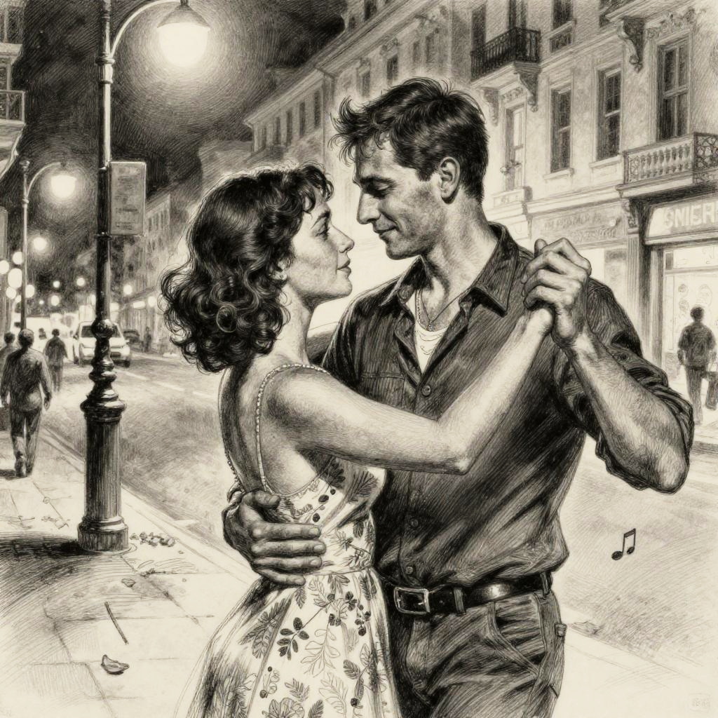 Realistic photo.A highly detailed, emotional sketch-style illustration of a couple dancing under a streetlight. The scene captures a deep sense of romance, with fine linework emphasizing their intertwined hands and the joy in their expressions that bring out the intricate textures and subtle movements within the composition. The background features a softly lit city street at night, harmonizing with the central subject, adding to the overall atmosphere. Every aspect, from the delicate play of light and shadow to the subtle elements of nature, such as falling petals or soft music notes, is rendered with thoughtful shading and delicate strokes to convey a sense of calm and reflection. realistic photo