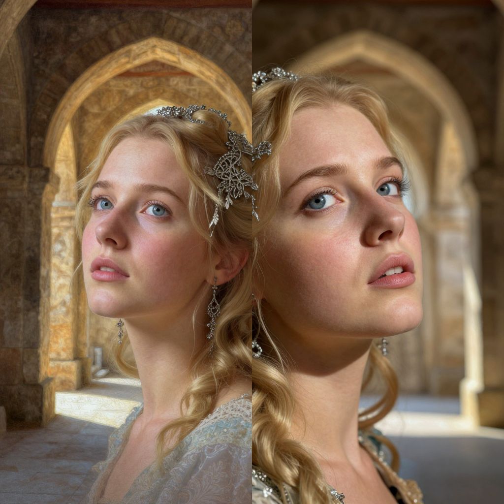 This photograph features a side-by-side comparison of a young blonde woman with light blue eyes and fair skin. She has wavy hair adorned with an intricate silver hairpiece and wears delicate silver earrings. Her expression is serene, with slightly parted lips and a gentle gaze. The background consists of a sunlit, arched stone wall, adding a medieval or historical ambiance. The lighting highlights her smooth complexion and subtle freckles. She is dressed in a light, possibly lace, garment, visible in the left image. The right image is a close-up, emphasizing her facial features and the detailed texture of her hairpiece and earrings.