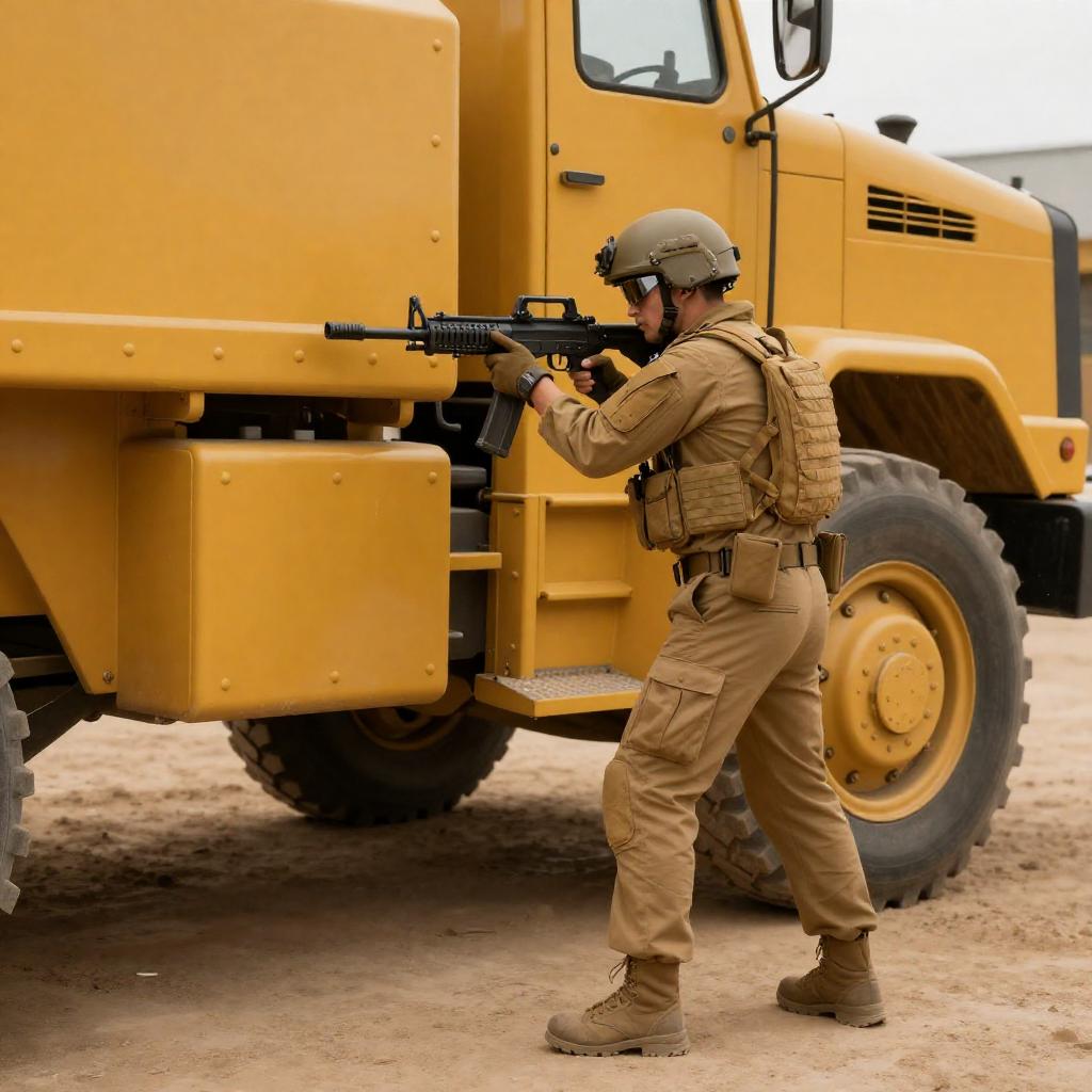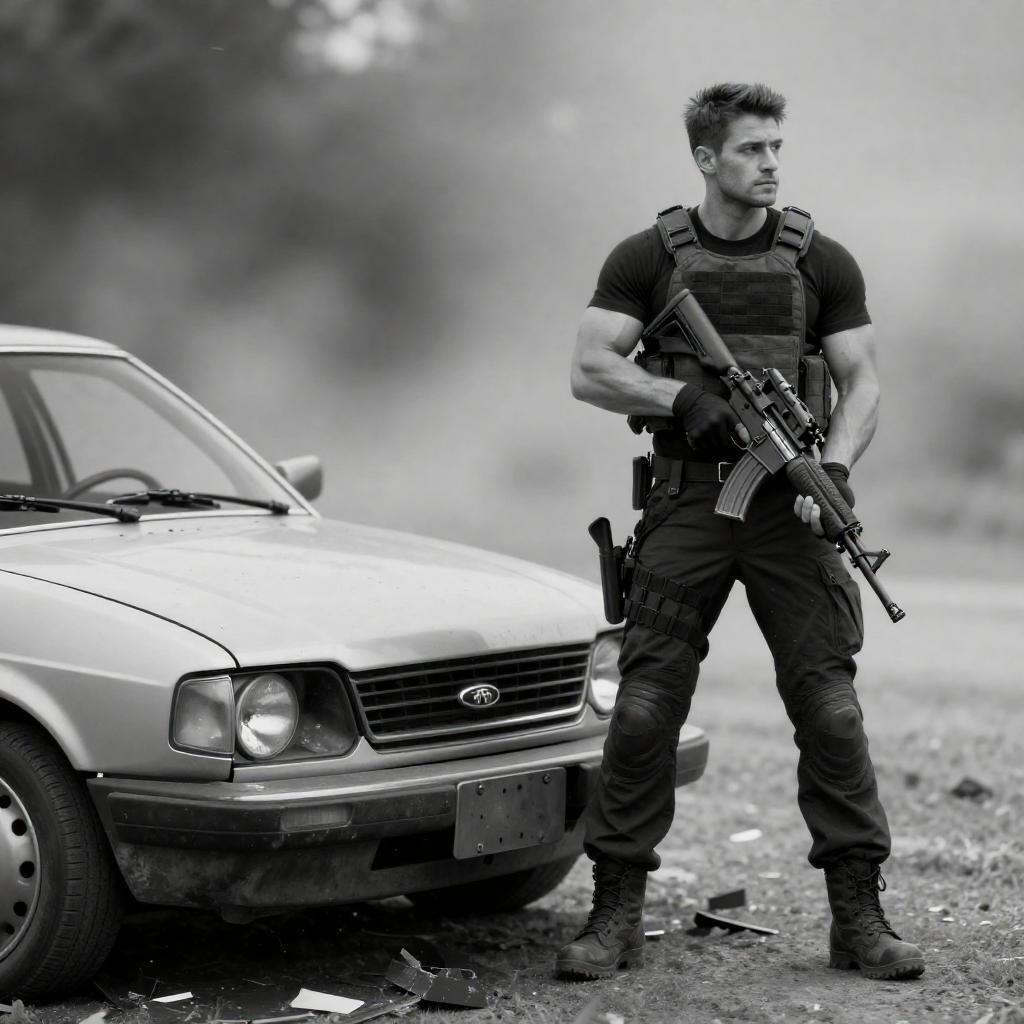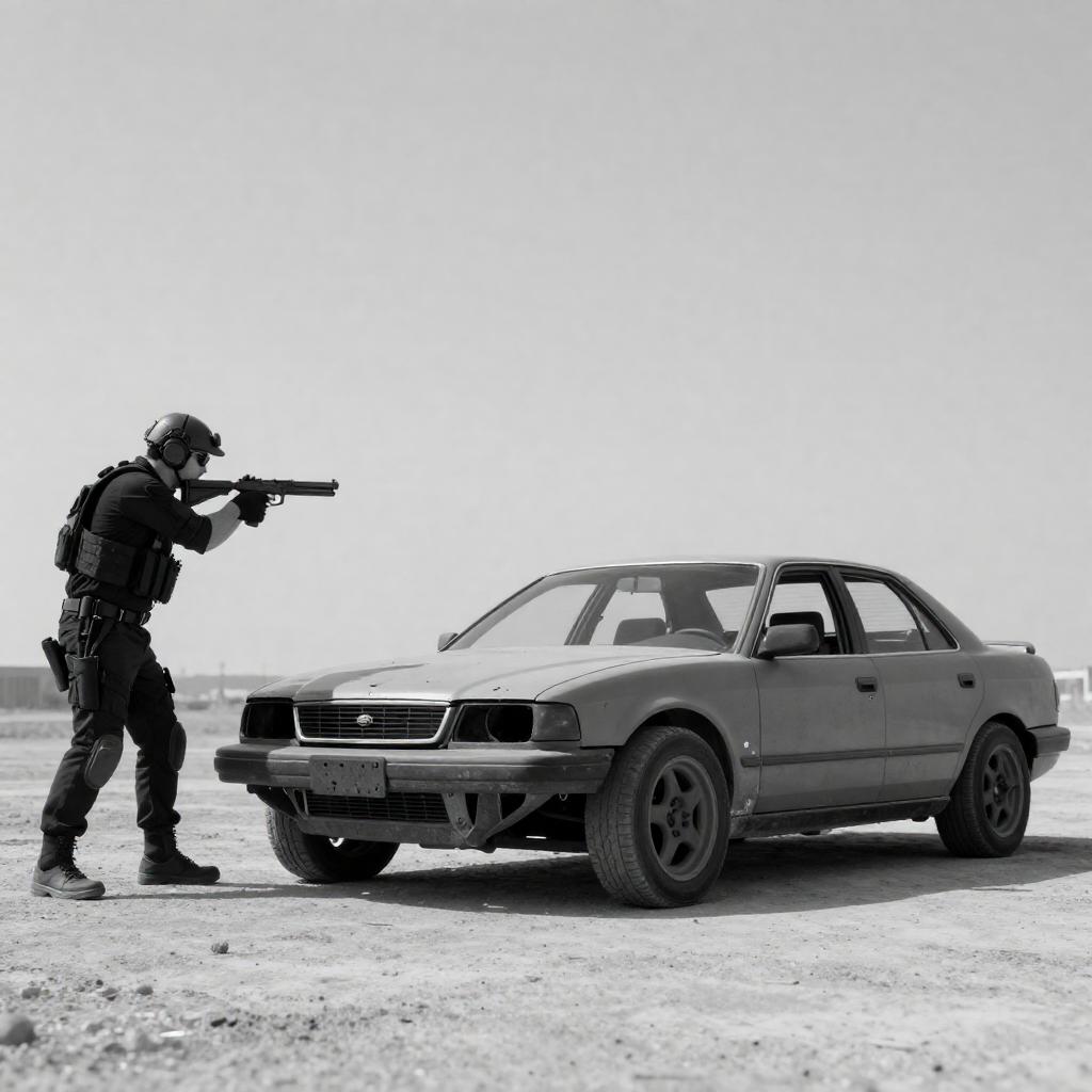 A black-and-white photograph of a man in tactical gear aiming a gun at a heavily modified, bullet-riddled car with a lowered suspension and large wheels. The car is parked on a barren, flat surface with a bright, overexposed sky in the background. The man is positioned to the left, while the car is centered.