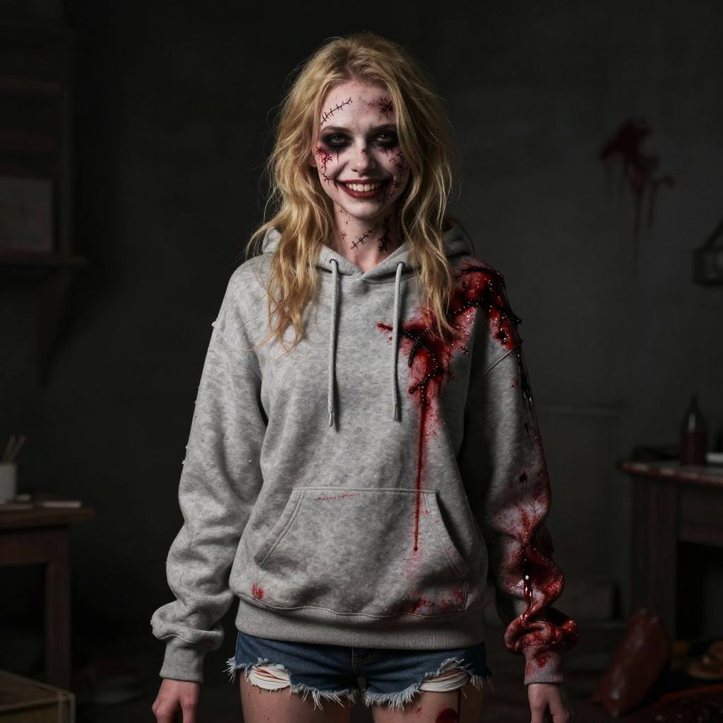 (masterpiece:1.2, best quality), photorealistic, (hyperrealistic:1.2), beautiful, a 23yo woman, solo, blonde hair, stitched face, patchwork skin, scars, sadistic grin, crazy expression, hoodie, shorts, (perfect anatomy), creepy, blood, textured skin