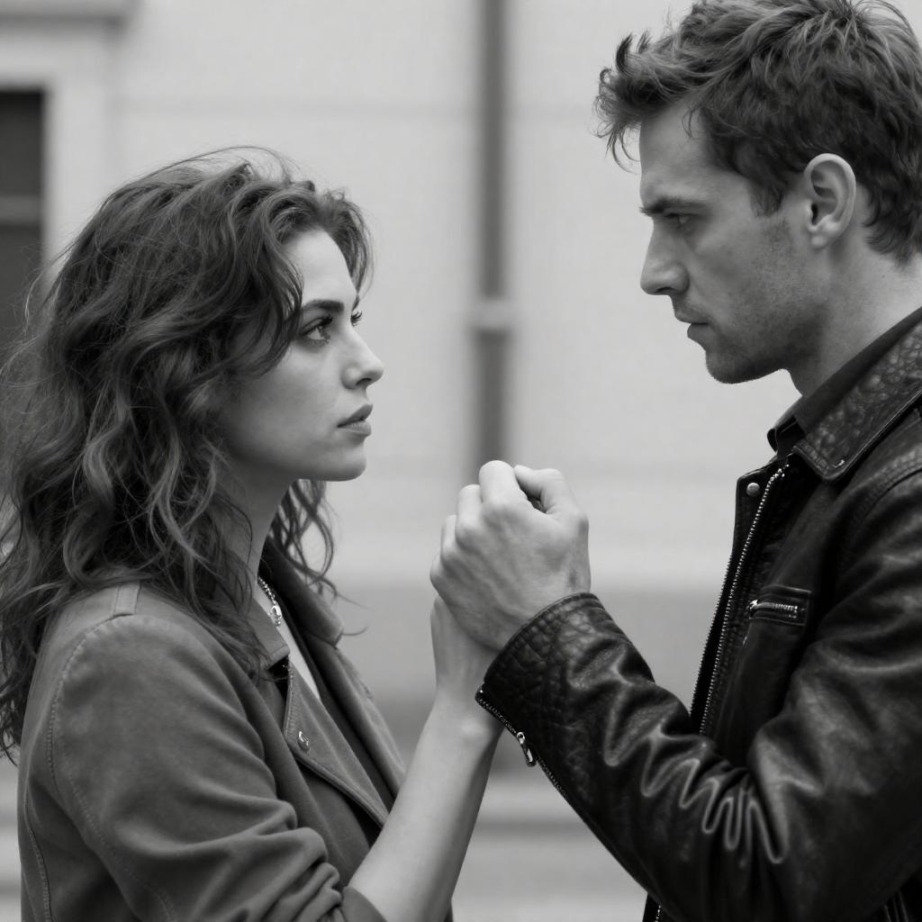 Black-and-white photograph of a man and woman in a close, intense interaction. The woman, with tousled hair, reaches up to grasp the man's wrist. He wears a leather jacket, his face partially shadowed. Background is blurred, suggesting an indoor setting. The woman's expression is focused, while the man's is stern.