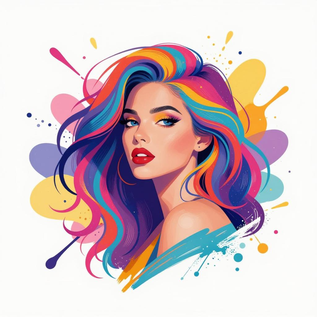 This vibrant artwork features a woman with flowing, colorful hair surrounded by abstract splashes of paint. The illustration captures a whimsical and energetic style, blending elements of pop art and modern graphic design. The bold colors and expressive forms evoke a sense of creativity and inspiration.