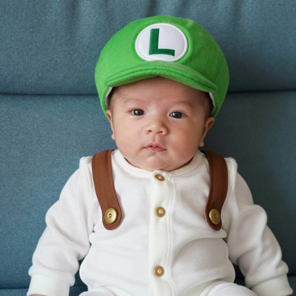 Newborn golf outfit, photorealistic portrait of cute toddler boy, short black cap with white Nike , white polo shirt with two buttons, small black Nike on shirt, standing against plain light beige background, soft natural light, toddler with big brown eyes, slightly parted lips, light brown skin, short dark hair, neutral expression, upper body visible, clear focus, slight shadow on left side, minimalistic background, simple and clean composition