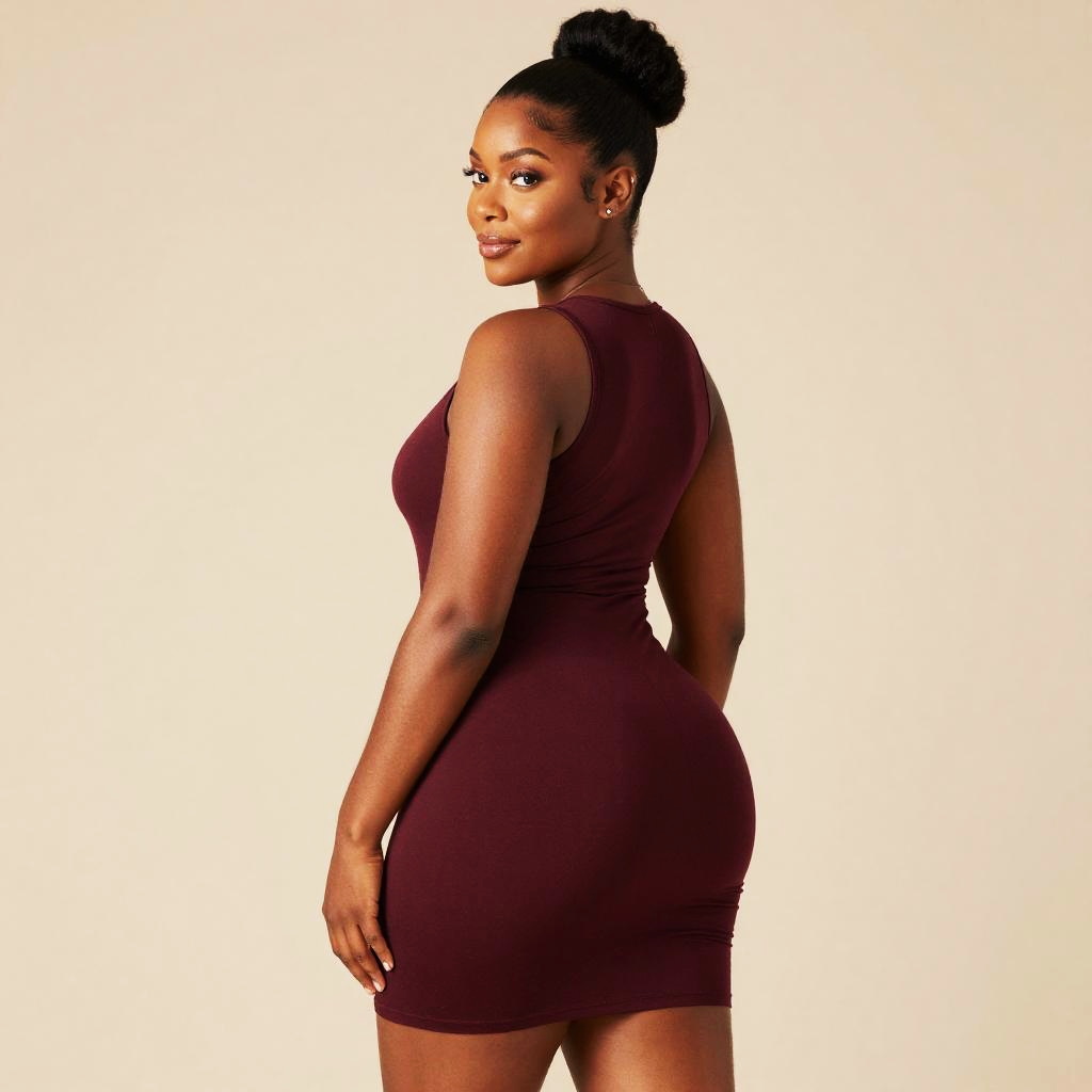 Photograph of a confident, curvy Black woman with dark skin and a high bun hairstyle, wearing a tight, sleeveless, maroon mini dress that highlights her hourglass figure. She is looking over her shoulder with a subtle smile, her right hand resting on her hip. The background is a plain, bright white, making her the focal point. Her makeup is glamorous with defined eyebrows, long eyelashes, and nude lips. The lighting is even, emphasizing her smooth skin and the dress's form-fitting texture. The overall style is modern and elegant.
