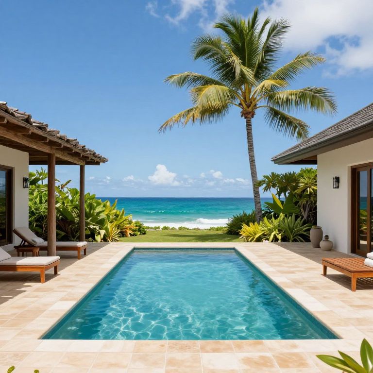 Hale-Ae-Kai, a Kauai, Hawaii ultra-luxury villa rental, showcases a serene outdoor setting with a pristine rectangular pool bordered by beige tiles, flanked by wooden lounge chairs under a rustic pergola, and framed by lush greenery, a vibrant palm tree, and a breathtaking view of the turquoise ocean beyond.
