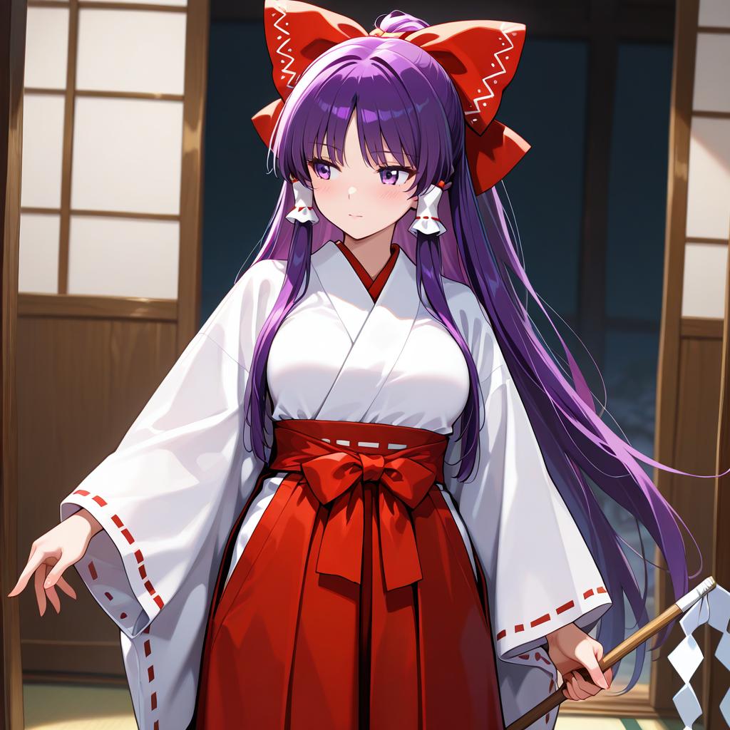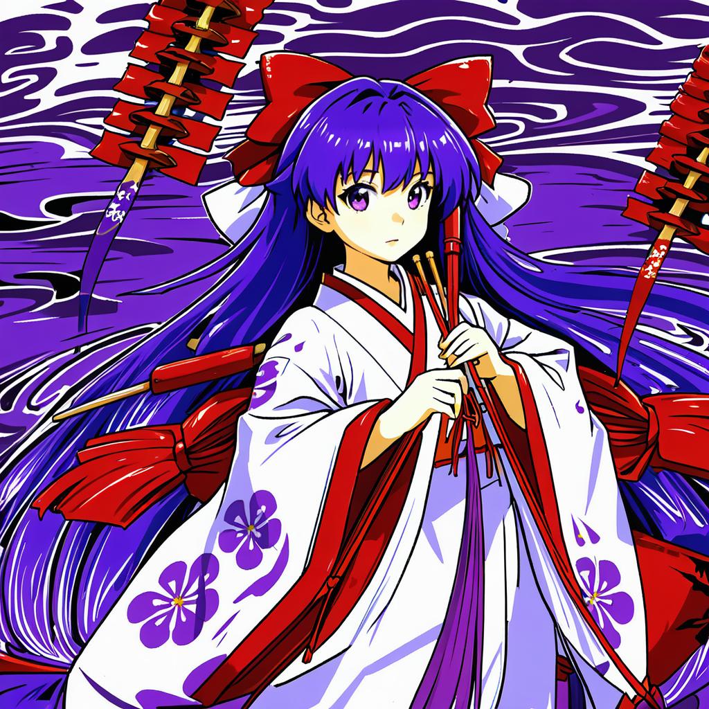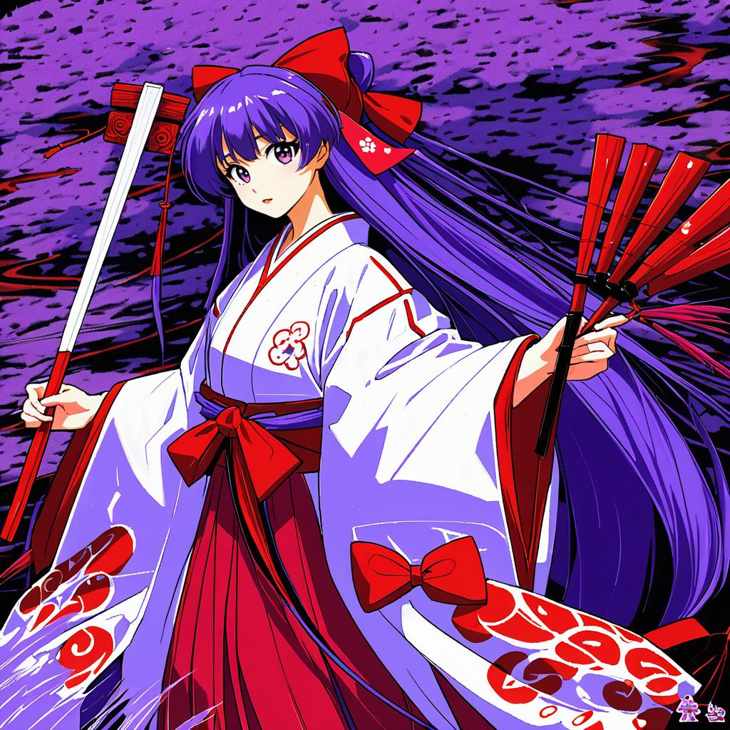 Hakurei reimu (pc-98), touhou, 1girl, purple eyes, purple hair, long hair, very long hair, sidelocks, hair bow, hair tubes, white kimono, white kimono, red bow, long sleeves, wide sleeves, miko, miko, gohei, red hakama, by artist gin (ginshari), illustrious