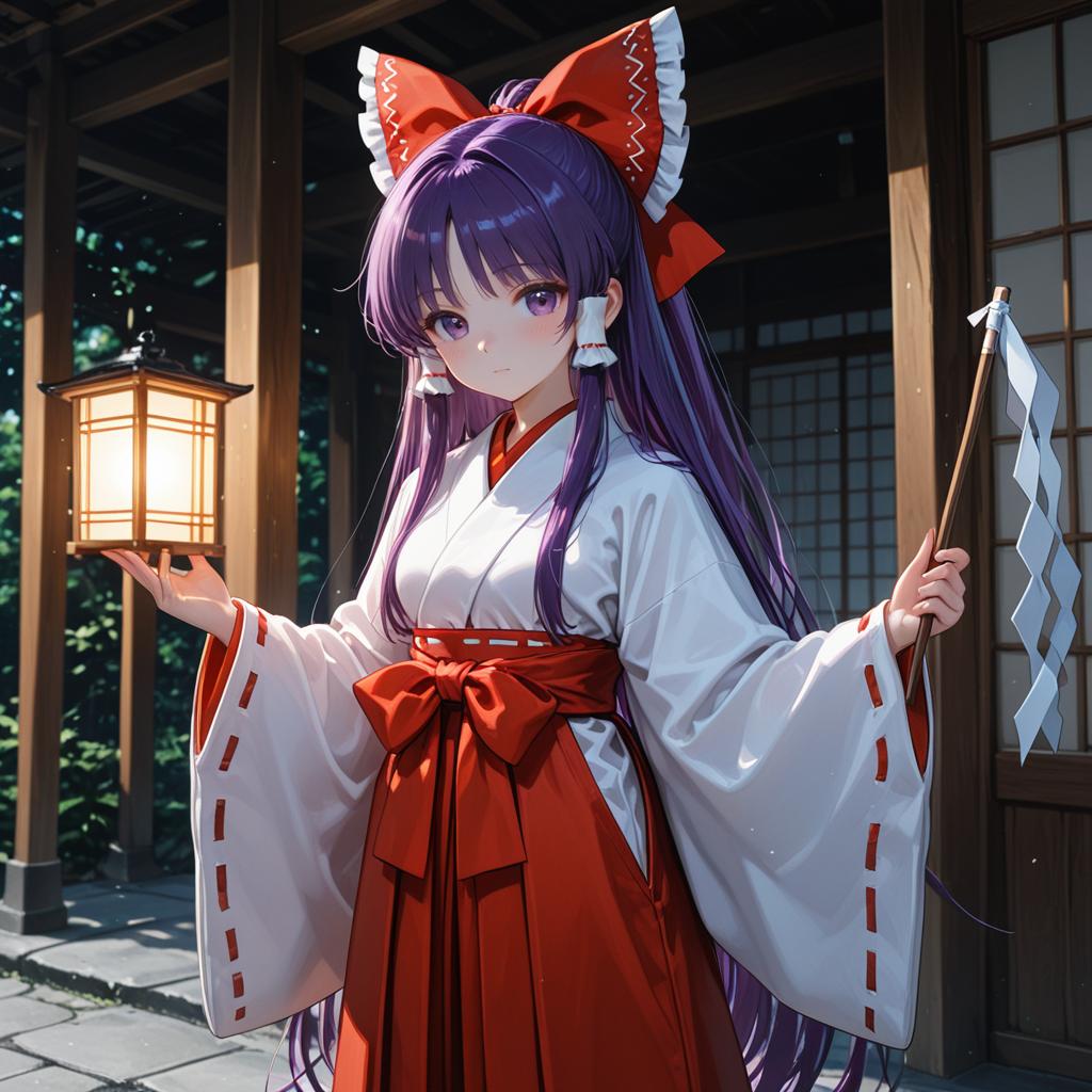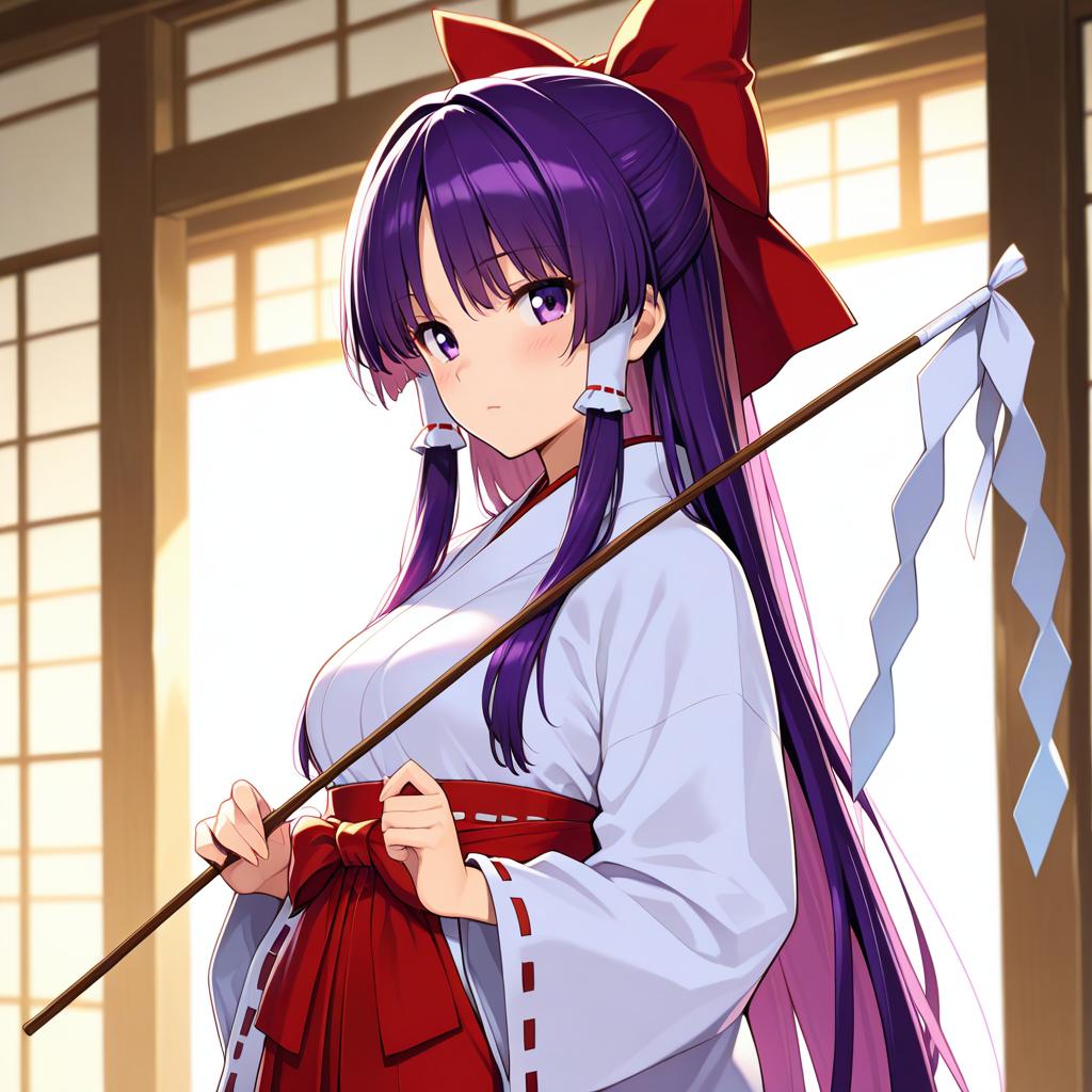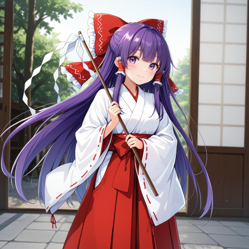 Hakurei reimu (pc-98), touhou, 1girl, purple eyes, purple hair, long hair, very long hair, sidelocks, hair bow, hair tubes, white kimono, white kimono, red bow, long sleeves, wide sleeves, miko, miko, gohei, red hakama, by artist gin (ginshari), illustrious
