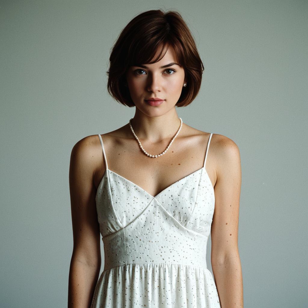 Modern retro outfit ladies,1girl, solo, realistic, dress, brown hair, lips, looking at viewer, short hair, short sleeves