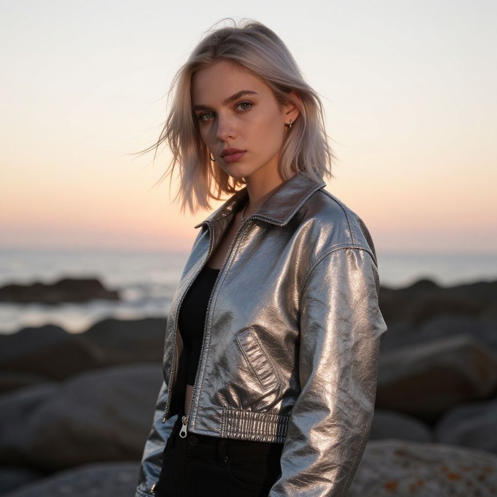 A young woman with platinum blonde hair stands on a rocky beach at sunset, wearing a reflective metallic jacket that catches the fading light. The soft breeze gently moves her hair as she gazes confidently into the camera, blending natural beauty with an edgy, modern fashion vibe.