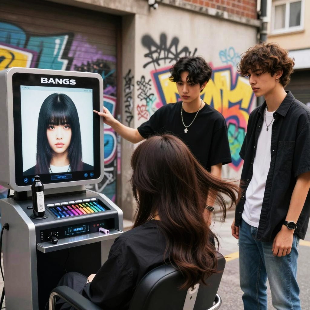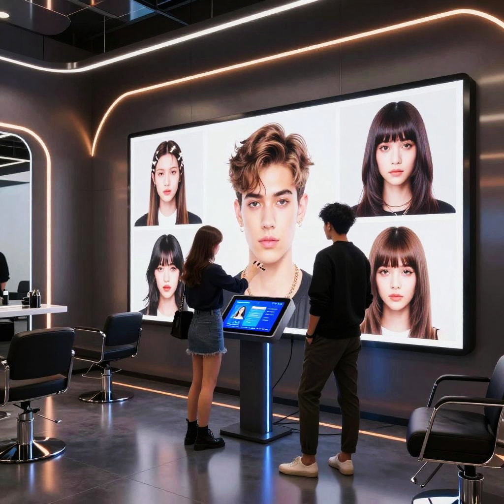 Hairstyle try on online futuristic salon, people standing in front of large digital screens showcasing multiple hairstyle options, neon lights, sleek modern interior, interactive touch controls, richly detailed environment blending technology and fashion