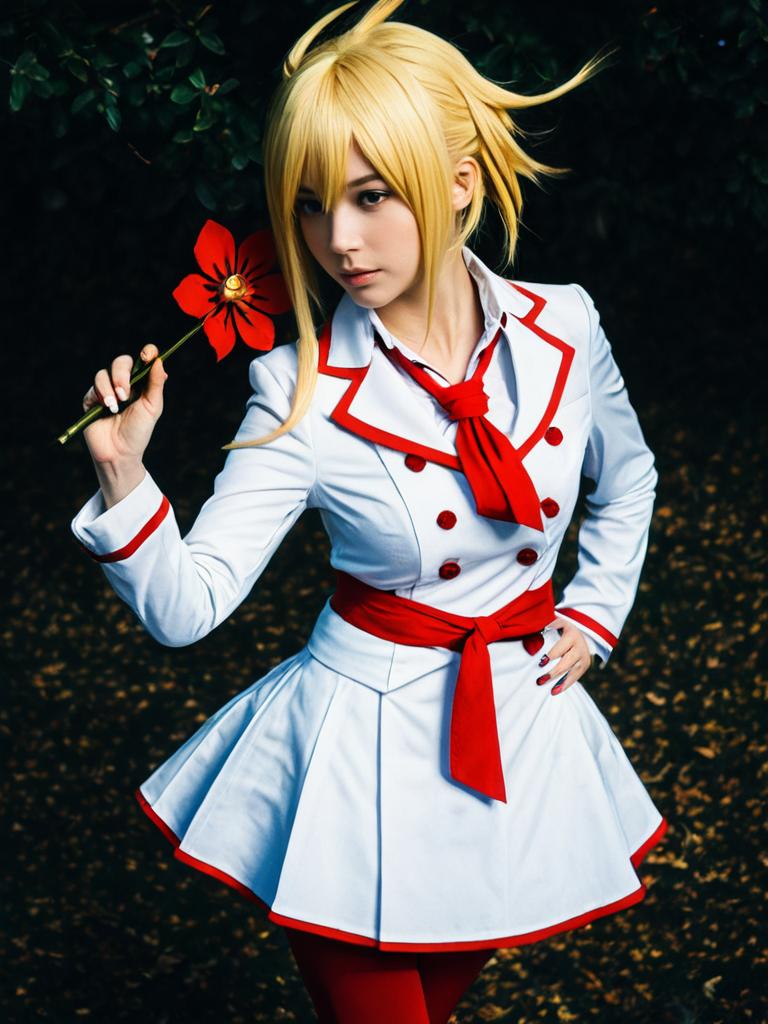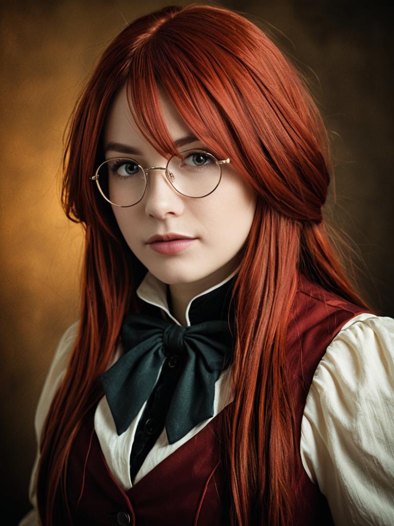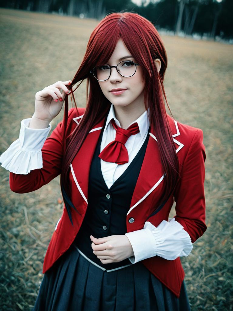Sexy cosplay woman character wearing Grell Sutcliff costume. Realistic photo. Jane Doe dressed as Grell Sutcliff --sref 1388