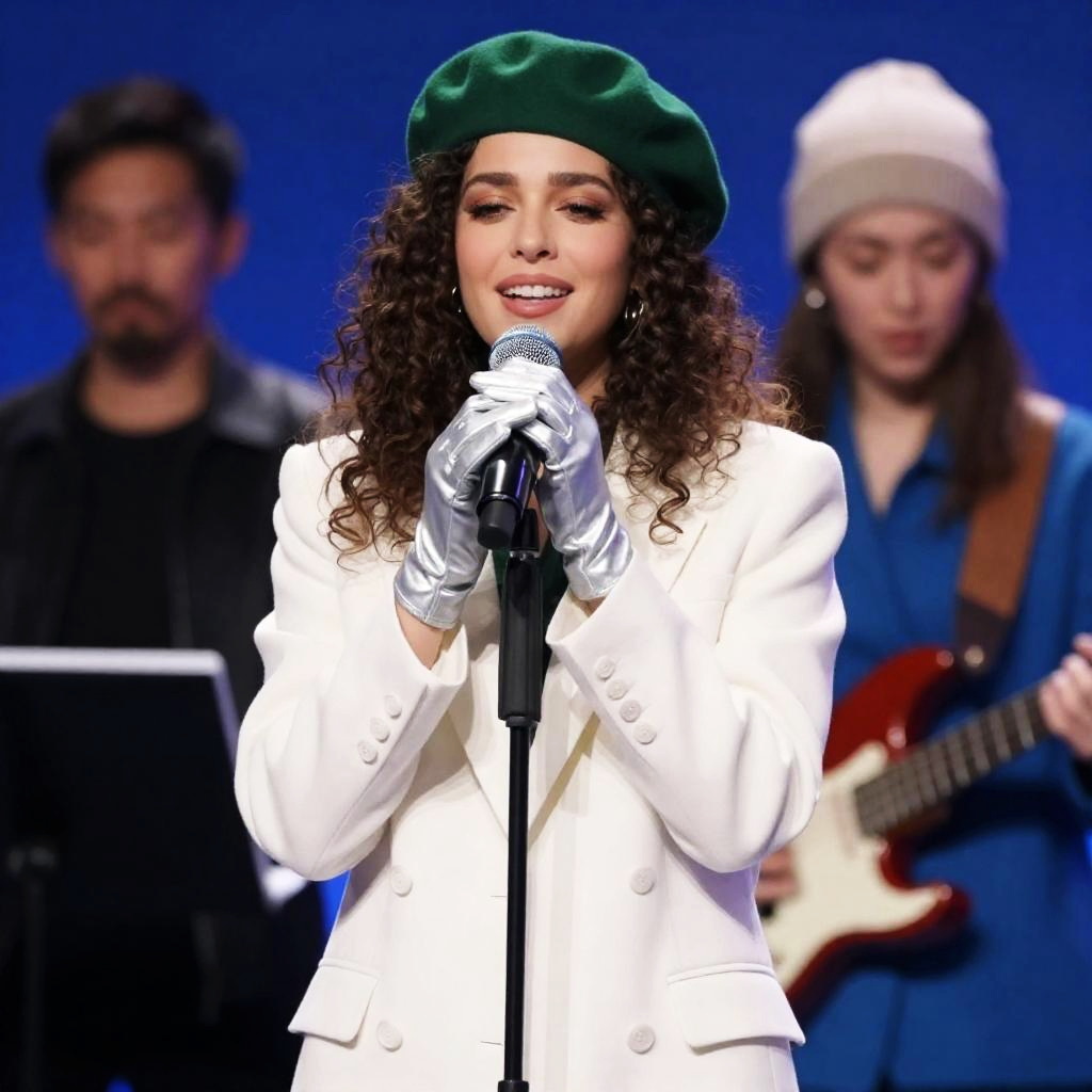 Woman in red plaid dress and red fur jacket, holding microphone, singing passionately. Plaid hat, black belt with silver ring. Videocamera to the right, person operating it. Bright background. Blonde hair, smiling. Two people, one visible hand.