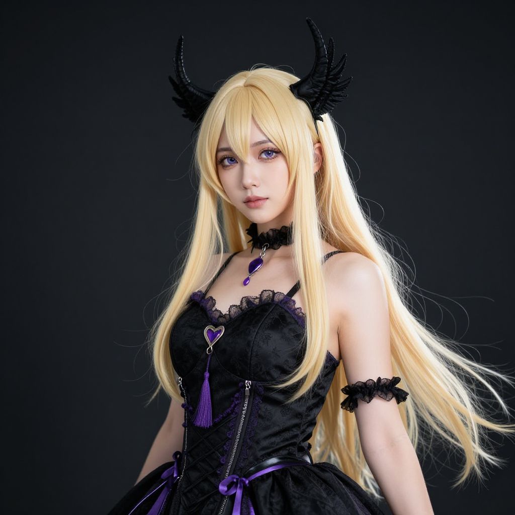 Woman with blonde hair wearing a black and purple costume with a crown on her head.
