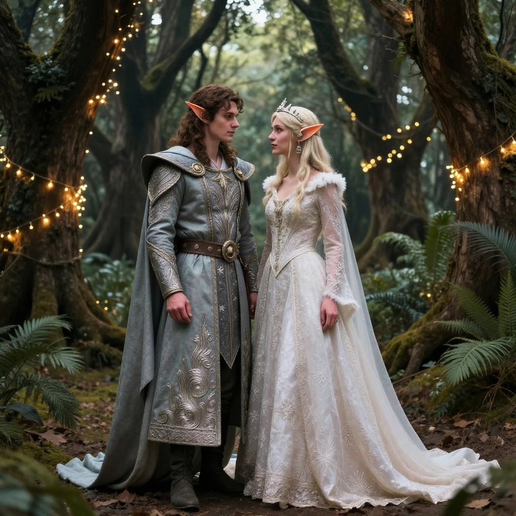 Elf themed wedding featuring mystical woodland setting, ornate elven attire with intricate silver embroidery, ancient trees decorated with twinkling fairy lights, dreamy and romantic mood