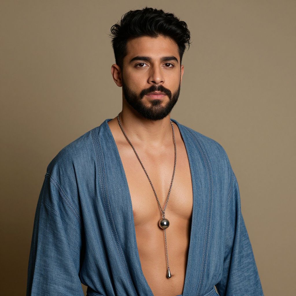 Drippy outfit man costume, 1boy, male focus, solo, facial hair, beard, necklace, jewelry, black hair, mustache, robe, standing