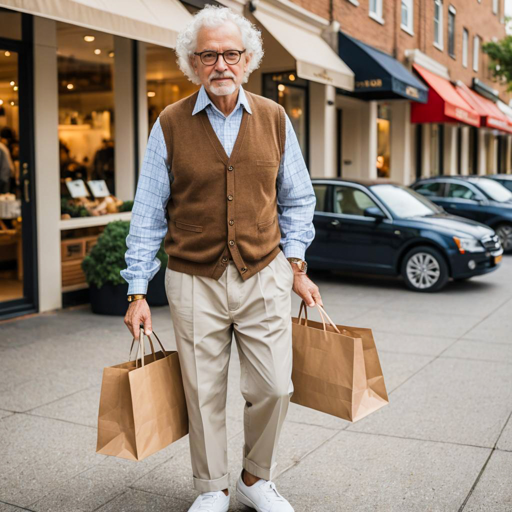 Portrait of an elderly man with white curly hair and spectacles walking outdoors carrying brown paper shopping bags. He wears a retro chic brunch outfit consisting of a white shirt, beige cable knit sweater vest, navy blue vest, khaki pants, and a brown belt. The background shows a clothing store with racks of garments displayed outside.
