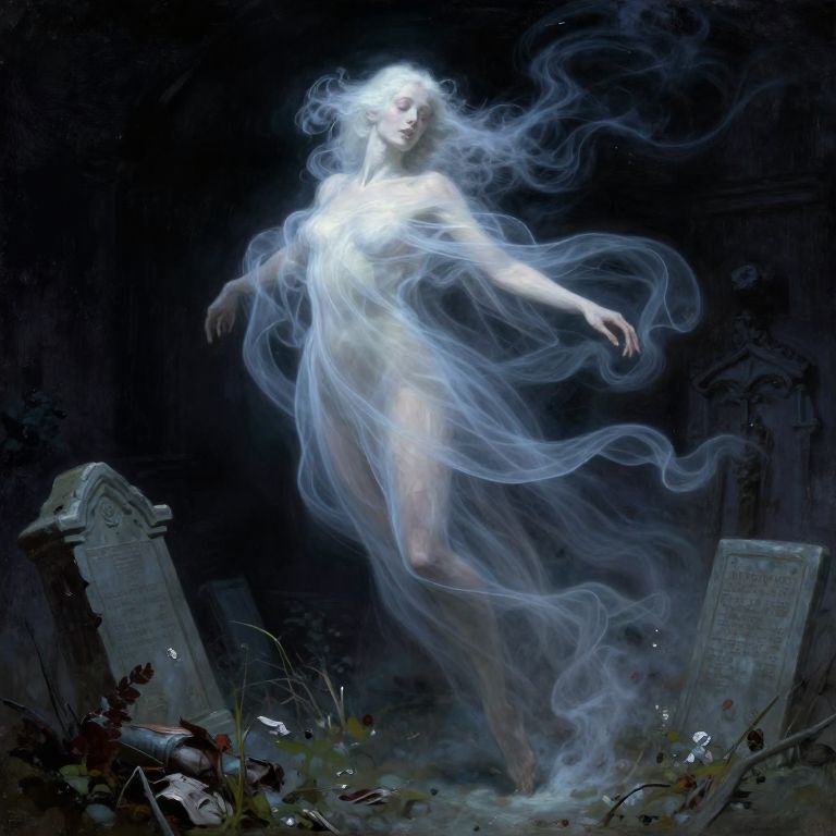 A digital artwork depicts a ethereal, ghostly woman with translucent, flowing white hair and mist-like appendages surrounding her. She is nude, with a glowing, luminous white chest, and is floating in a dark, eerie graveyard. Two weathered tombstones are positioned in the foreground, surrounded by overgrown grass and scattered leaves. The background is shrouded in darkness, highlighting the woman's luminous presence. Her expression is serene yet haunting, and her pose is graceful, with one leg slightly raised and arms gently extended. The overall atmosphere is mysterious and otherworldly.