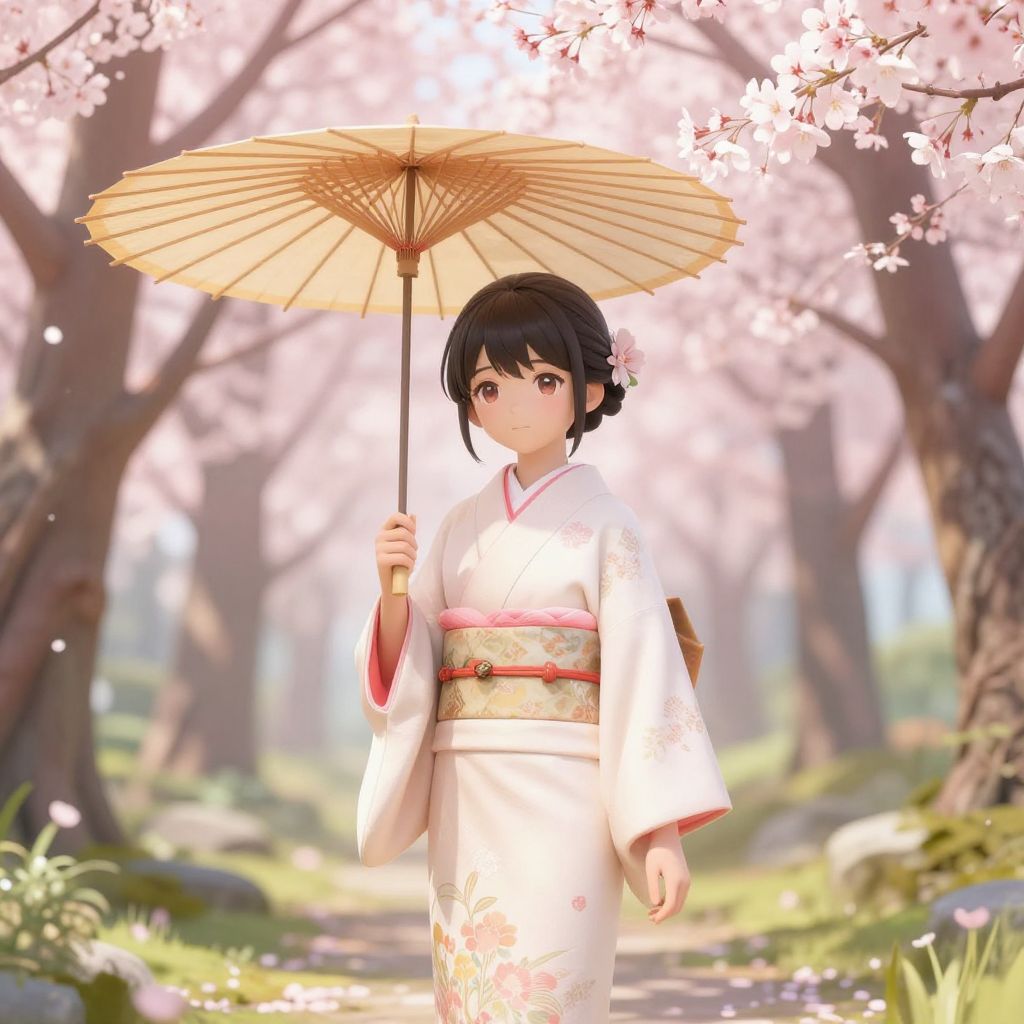 3d anime art of a serene forest with cherry blossom trees in full bloom, a young anime girl in traditional kimono holding a paper umbrella, soft pastel color palette, intricate hair and fabric details, natural sunlight filtering through trees, magical atmosphere