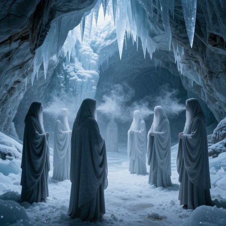 In a cavernous sanctuary of icy serenity, cloaked figures stand in silent reverence, their breaths mingling with the crystalline whispers of eternity, where the cold embrace of the earth cradles the soul’s deepest yearning for connection and transcendence.