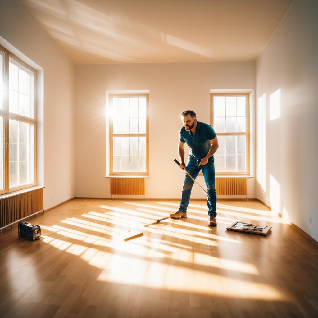 Space Planning a hyperrealistic photography of a hurt parquet installer, tools lying around, room flooded with light, high point of view, face distorted in pain, screaming in pain, closed eyes, face visible, facing the camera, sunlight coming through the windows, soft sun rays, bright background, focus on face, blurry background, cinematic atmosphere, overly bright and beautifully colors, lots of light, wide-angle lens, include more of the scene, natural lighting, soft contrasts, 8k,