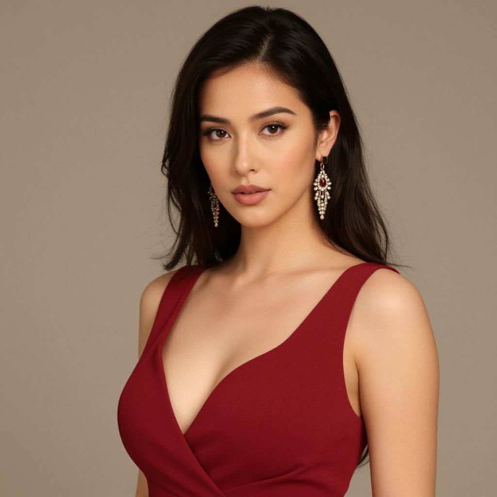 Maroon party wear dress, 1girl, solo, dress, jewelry, earrings, breasts, red dress, cleavage, realistic, looking at viewer