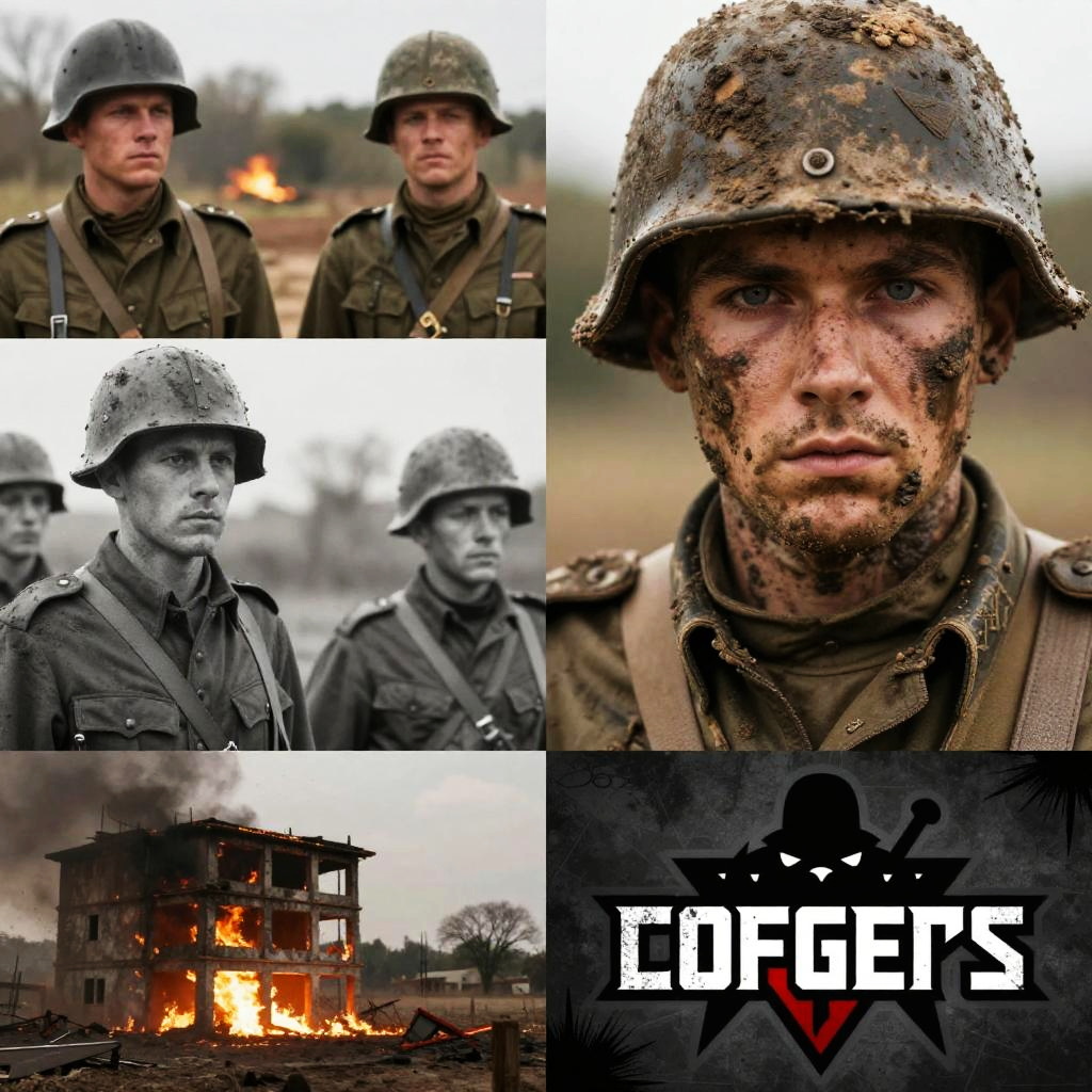 This collage-style image features a mix of photographs and digital art. It includes a gritty, mud-covered soldier with intense eyes in the top right, a historical black-and-white photo of a man and soldier in the middle left, a burning building in the bottom left, and a dark, game-like logo with text in the bottom right. The colors are mostly muted and realistic, with the soldier's photo standing out in bright, detailed contrast.