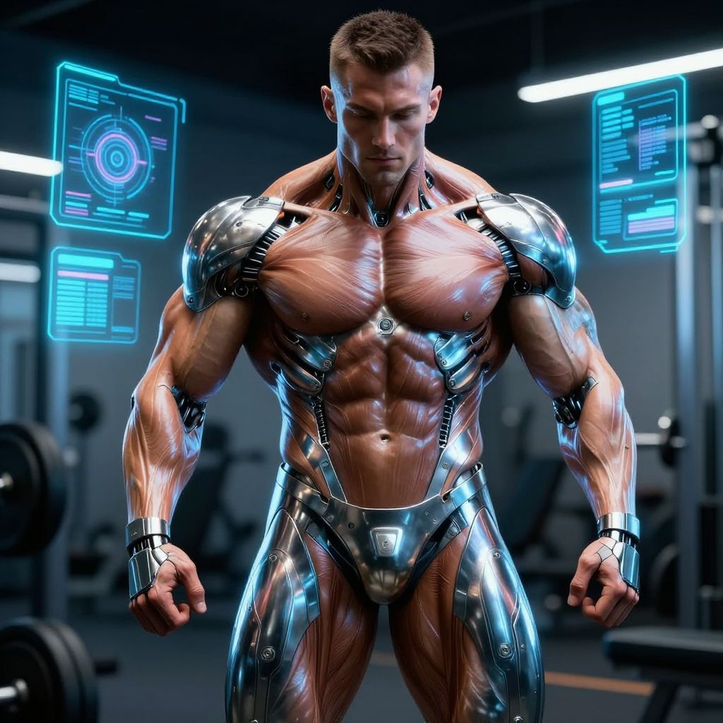 Ai bodybuilder generator depiction, futuristic AI-enhanced athlete with gleaming metal plates and synthetic muscles, bright neon highlights, digital cyber gym environment with holographic weights, photorealistic style, emphasizing strength and technological advancement