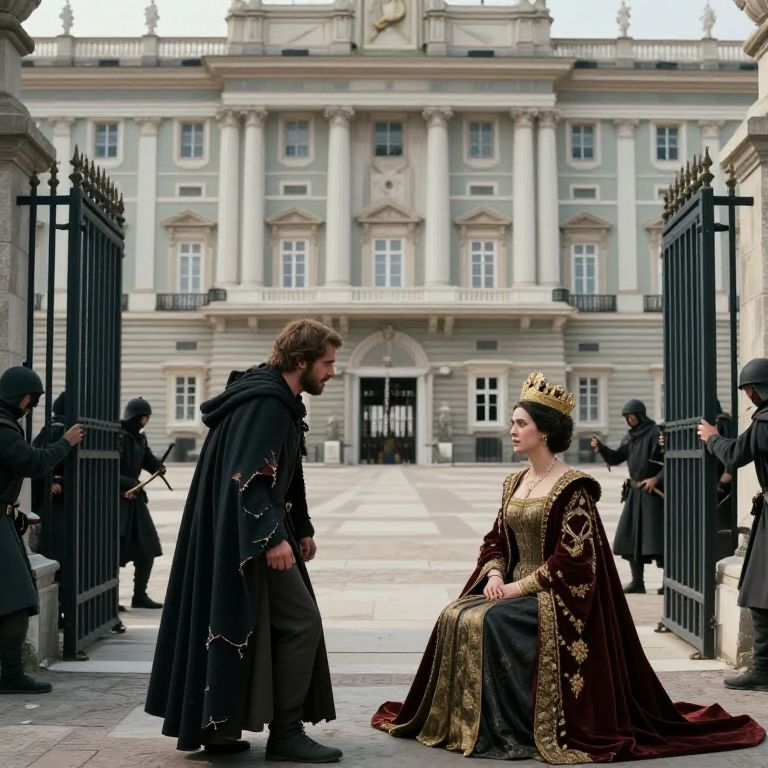 A cinematic wide shot of a majestic palace with tall columns and strict symmetry, while a rebel group breaks through ancient gates, one member with a torn cloak and raw emotional expression, confronting a seated queen in formal regalia with sharp, serious eyes—highlighting the tension between regal structure and rebellion.