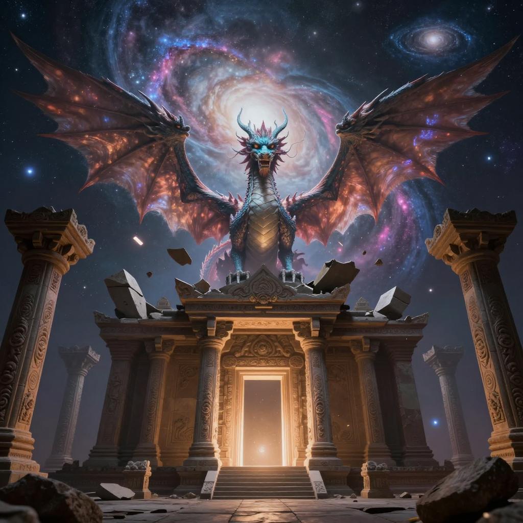 A highly detailed image of an ethereal celestial dragon with expansive wings circling above a shattered ancient temple. The scene is set underneath a swirling cosmic nebula filled with distant galaxies. The temple is surrounded by ancient carved pillars and broken stone ruins, illuminated by dramatic lighting and a glowing doorway. The magical atmosphere combines fantasy elements with cosmic scenery.