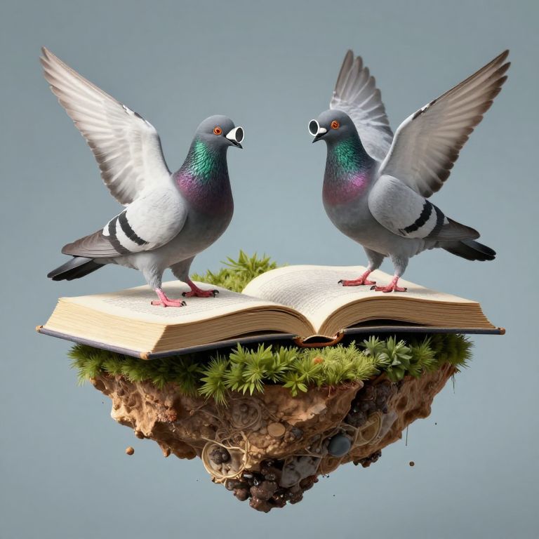 Photorealistic digital illustration of two colorful pigeons with iridescent green and purple necks, standing on an open, floating book with grass and soil. The book is suspended in mid-air against a gradient blue background. The pigeons have black and white striped wings, pink feet, and are mid-flap, creating a dynamic sense of movement. The book's pages are slightly curled, and the soil appears to have small roots and rocks. The image combines elements of realism with fantasy, creating a surreal and imaginative scene.