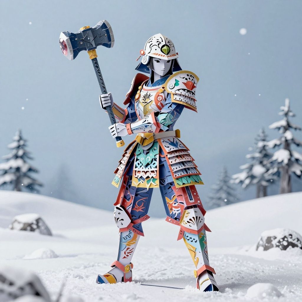 Kirigami representation of in the image, a female character is standing in a snowy landscape, ready for battle. she is adorned in vibrant armor that features an array of colors and intricate designs. in her hands, she firmly grips a large hammer, its head gleaming under the cold winter sky. a helmet rests on her head, concealing her identity but not her determination. her gaze is steady, reflecting the resolve of a warrior prepared to face any challenge. the snowflakes falling around her add a sense of tranquility to the otherwise tense scene, highlighting the stark contrast between the serene beauty of nature and the impending battle., intricate detail, cinematic, atmospheric, digital cinema ranger, 8k . 3d, paper folding, paper cutting, japanese, intricate, symmetrical, precision, clean lines