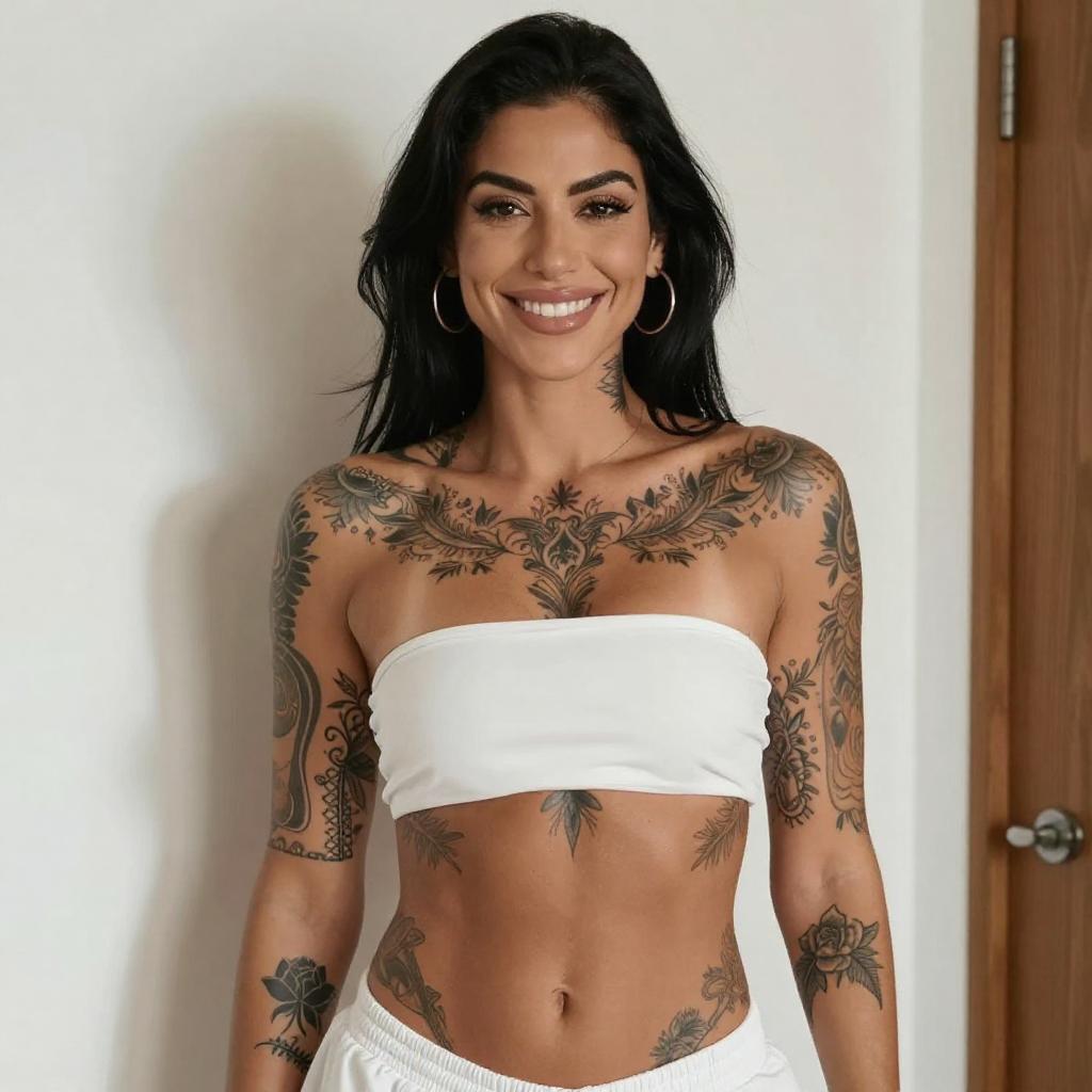 Photograph of a tattooed woman with long black hair, smiling, wearing a white bandeau top and white bottoms. Her extensive chest and arm tattoos feature intricate black ink designs. She has hoop earrings and is standing against a plain white wall with a wooden door frame on the right.