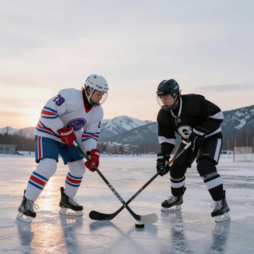 Photograph of two male ice hockey players facing each other. Player on left in white uniform with red and blue accents, number 4 on back, leaning forward. Player on right in black uniform with white accents, number 26 on back, also leaning forward. Both holding hockey sticks, sticks touching. Clear ice rink, blue gradient background, distant mountains, bright sun in center. Players wearing helmets, gloves. Intense expressions.