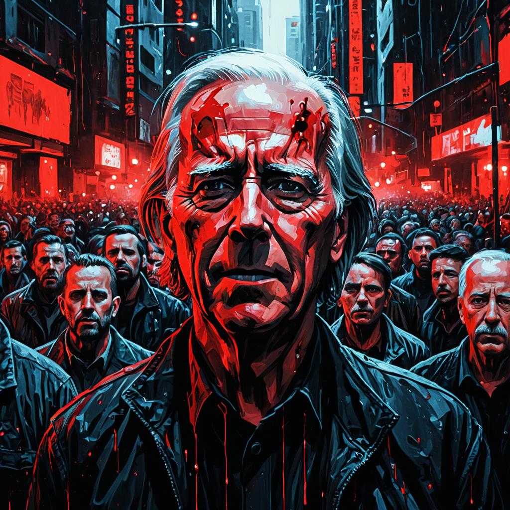 Digital artwork depicting a large crowd of men in dark clothing standing in a dimly lit urban street with red neon lights, featuring a central older male figure with white hair and a serious expression. The scene is rendered in a cyberpunk style with thick brushstrokes and dripping oil paint effects, emphasizing a dystopian atmosphere.