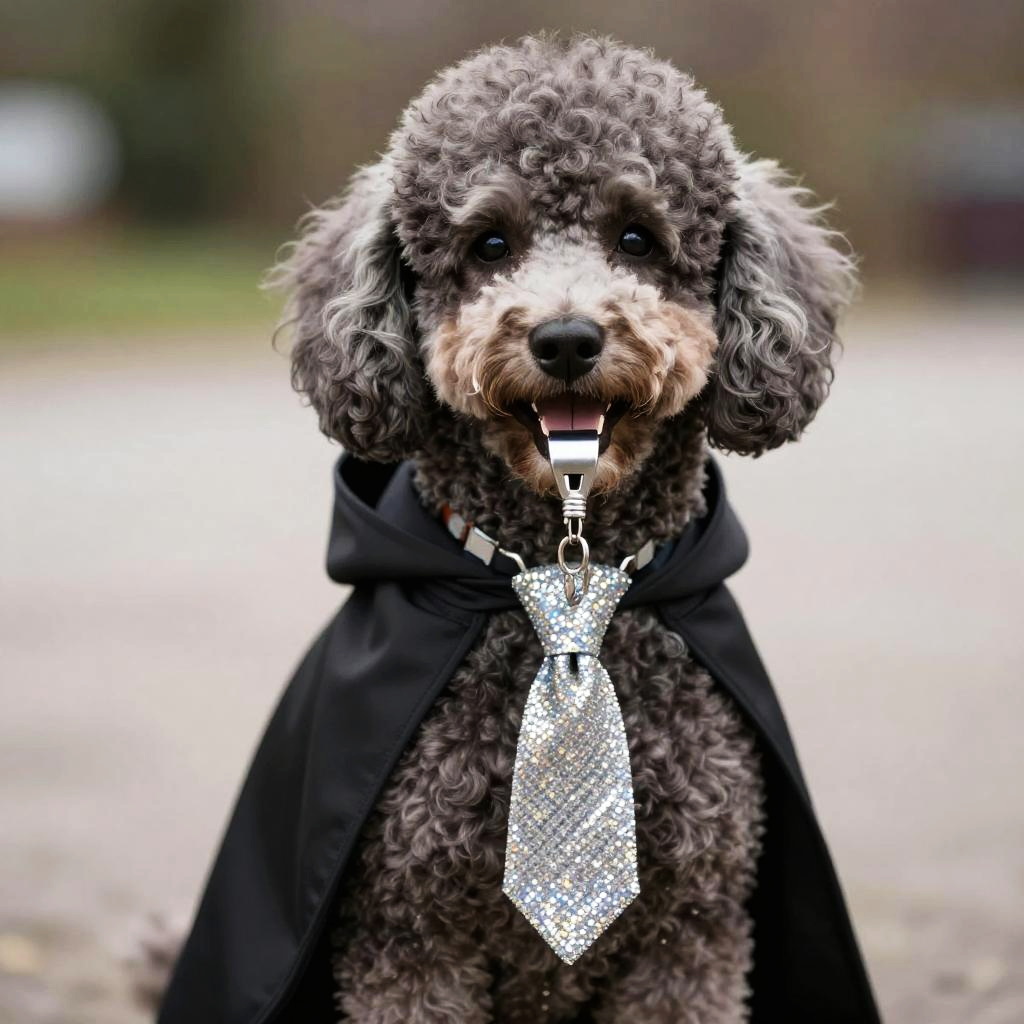 Realistic photo.[poodle] in a [cape] with [whistle] and a [glittery] tie realistic photo