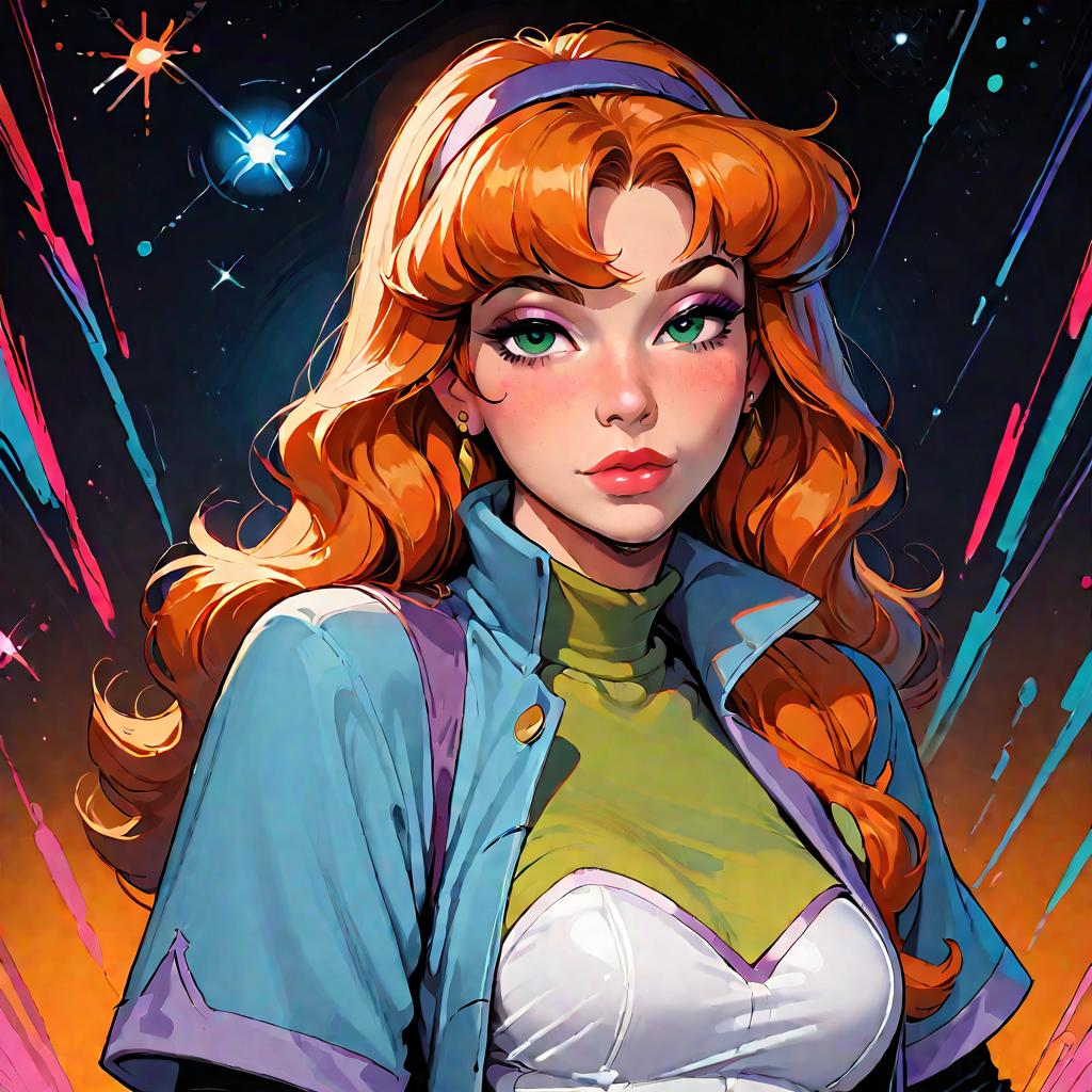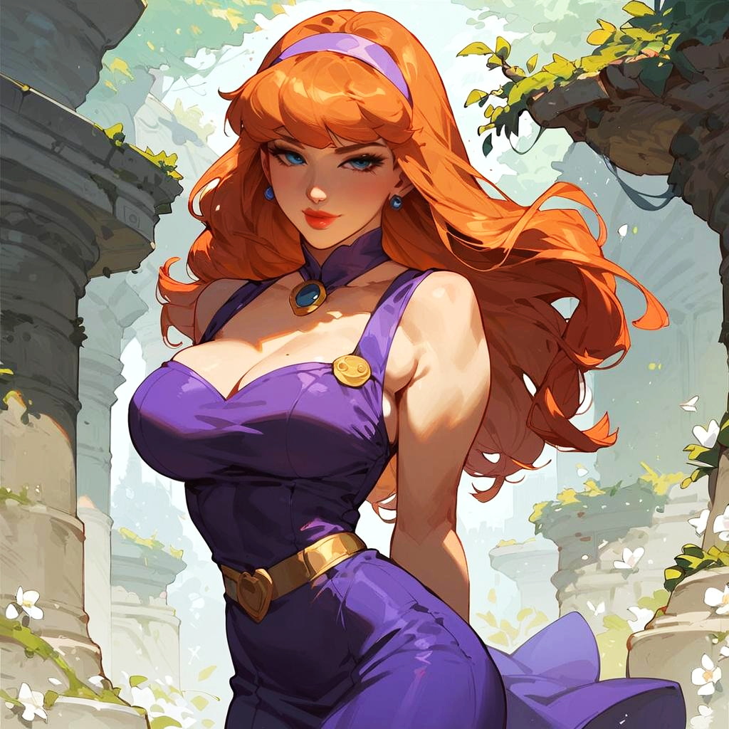 Score_9, score_8_up, score_7_up, score_6_up, score_5_up, futanari, solo, standing, looking at viewer, daphne blake, bedroom eyes, smirk, hands behind back, short_dress, orange hair, long hair