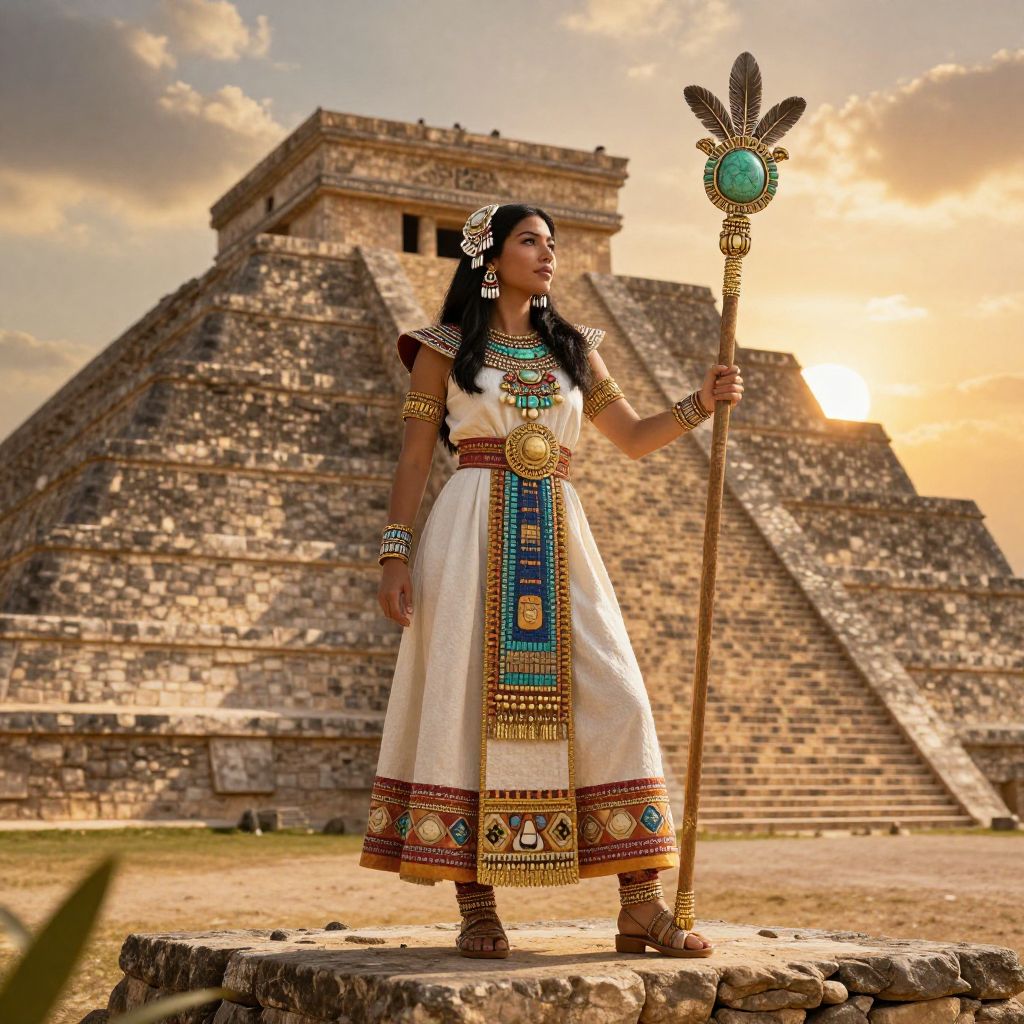 Photograph of an Indigenous woman standing in front of a large, ancient pyramid with a golden sunset in the background. She wears a white dress adorned with intricate blue, gold, and red patterns, gold jewelry, and a white feather in her black hair. She holds a tall, ornate staff with a turquoise center and feathered top. The pyramid is made of stone, with visible steps leading to the top. The woman stands confidently on a stone platform, with her gaze directed forward. The sky is filled with warm, golden hues, creating a dramatic contrast with the earthy tones of the pyramid.