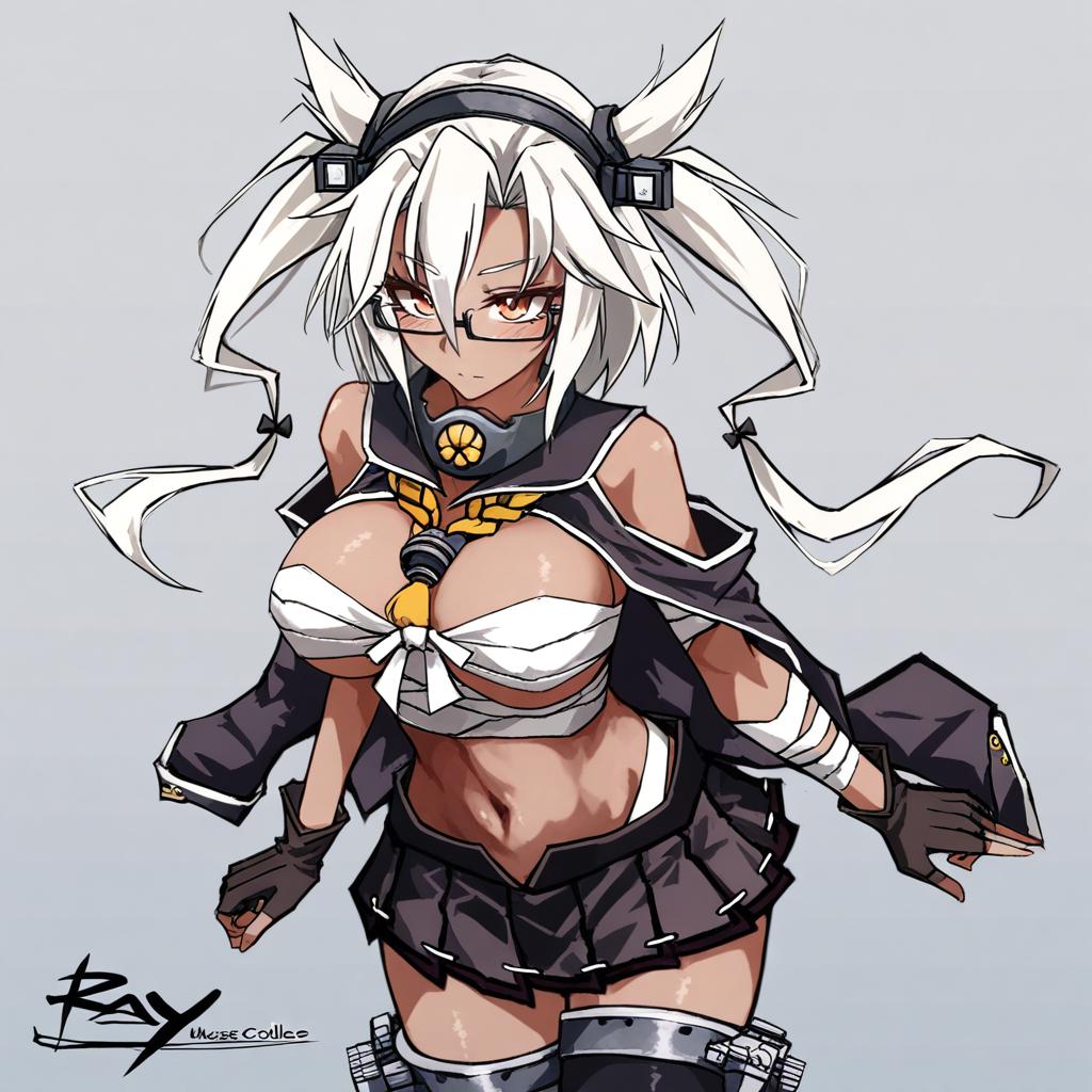 Musashi kai (kancolle), kantai collection, 1girl, dark-skinned female, red eyes, hair between eyes, glasses, pointy hair, long hair, blonde hair, white hair, two side up, twintails, large breasts, chest sarashi, navel, black gloves, fingerless gloves, black thighhighs, black skirt, pleated skirt, budget sarashi, headgear, miniskirt, by artist ray-k, animagine