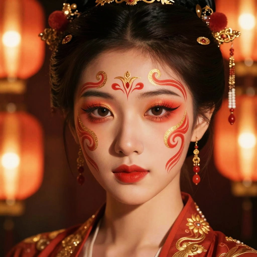 Chinese face filter, a vibrant digital portrait of a young woman with traditional red and gold makeup patterns swirling elegantly across her face, soft glowing lanterns in the background, intricate details, warm festive lighting, artistic fusion of modern and ancient styles.