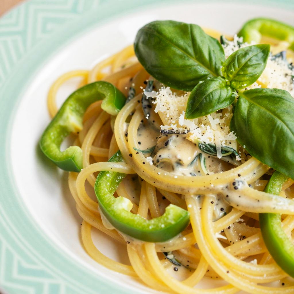 A close-up photo of a vibrant pasta dish. The dish features yellow spaghetti noodles, green bell pepper slices, and fresh basil leaves on top. The noodles are lightly coated in a creamy sauce, with a sprinkle of grated cheese. The background includes a green plate with a geometric pattern on the left edge. The colors are bright and fresh, making the dish look appetizing.