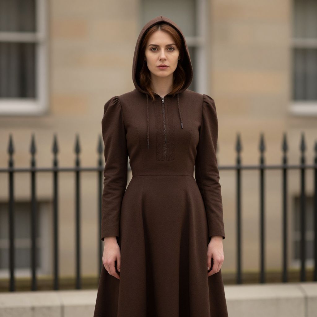 "Victorian Orphan Costume, woman in a brown dress and hoodie standing in front of a building"